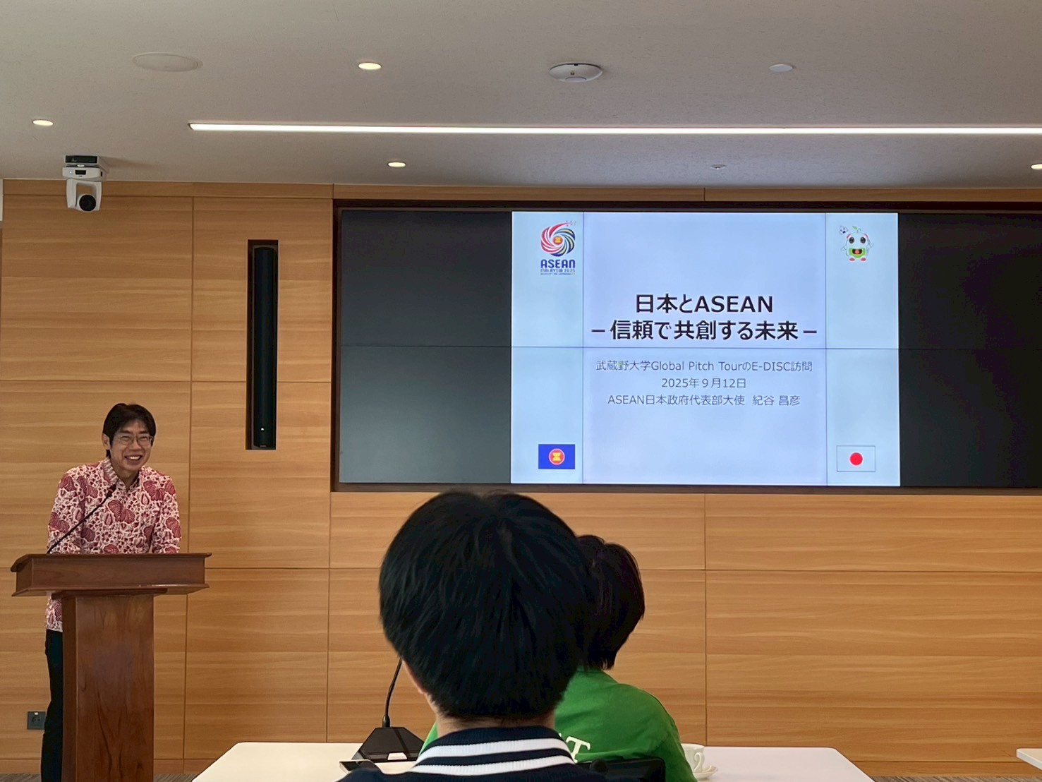 続いて登壇したのは紀谷大使です。大使からは、日本とASEANの協力の全体像について説明がありました。長年にわたり日本が地域を支援してきた外交・経済連携、教育協力の歴史が語られ、学生たちは「政策の積み重ねが国際協力の基盤を作っている」ことを実感しました。