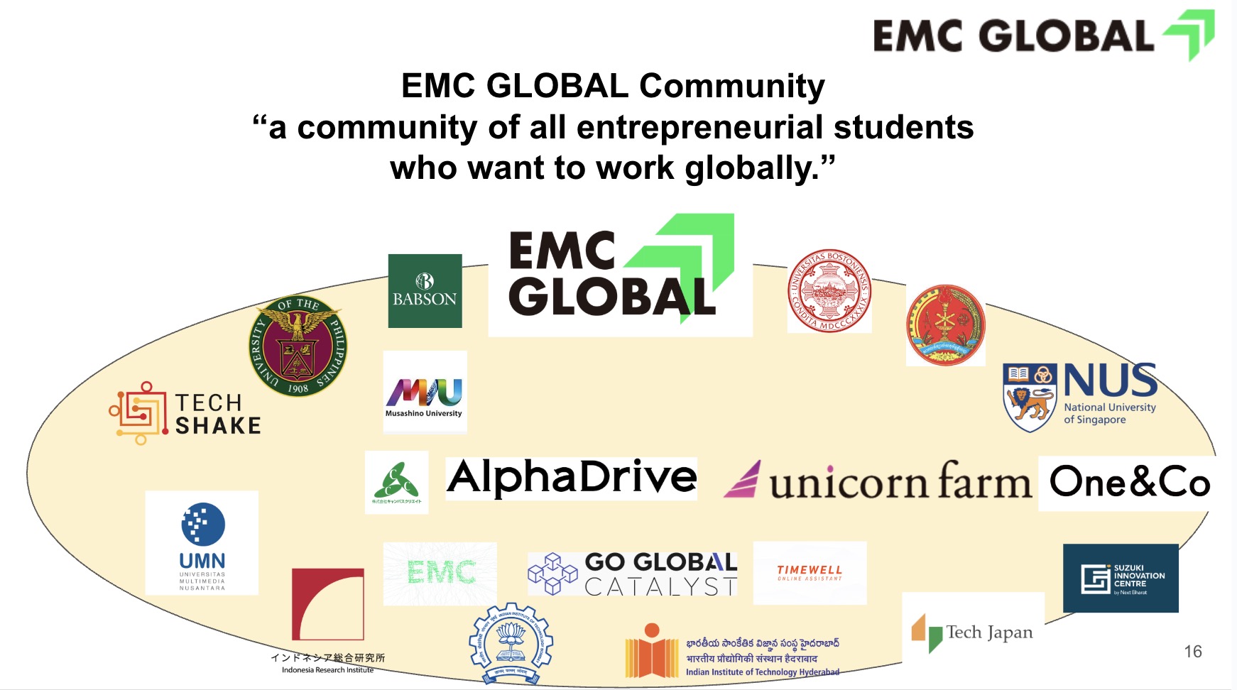 まずは、学生でも、社会人でも、グローバルに活躍したいという志を持つ人や、そういった人材と繋がりたい人々が集うコミュニティをEMC GLOBALのSlackの中に作ります。ここで様々な交流を重ねながら、各種プログラムの応募や交流を行います。コミュニティの中には、インドやインドネシア、シンガポールやフィリピンの学生たちもいます。