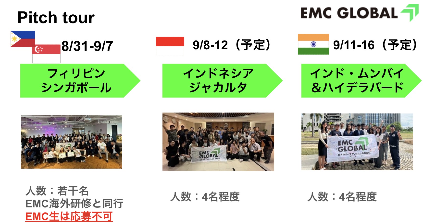 今年はフィリピン&シンガポール、インドネシア、インドの3つのツアーで参加者を募集します。応募はEMCの学生でなくても、武蔵野大学の学生でなくても、日本国内の大学・大学院・高等専門学校・専門学校・高校に所属する学生・留学生で、自身のビジネスをピッチできるレベルの英語力を持つ方ならが応募可能です。