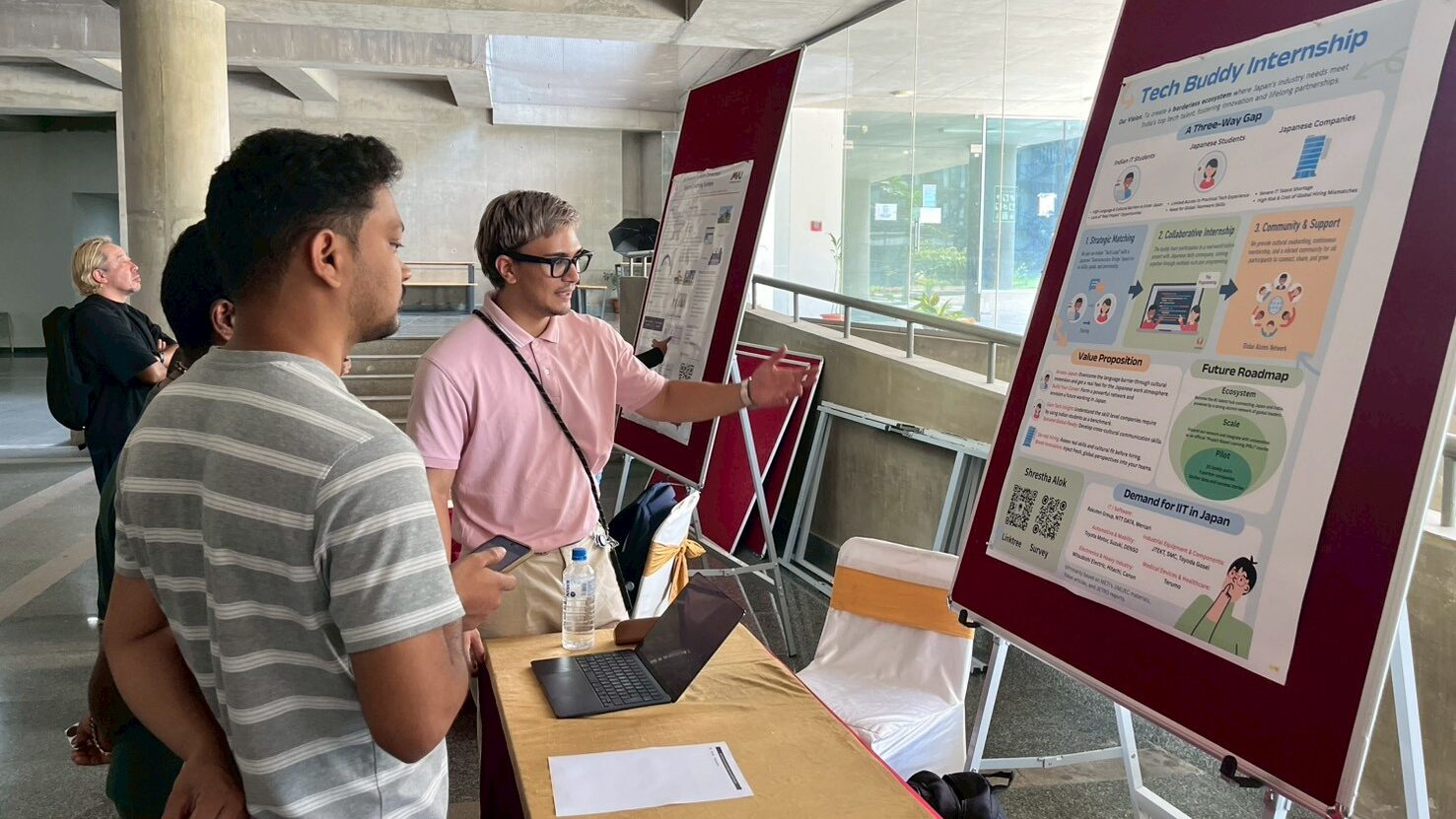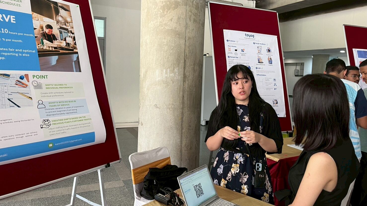 慣れない土地で英語でのプレゼンテーションに挑む学生たちは、緊張と期待の入り混じった表情でブースに立ちました。